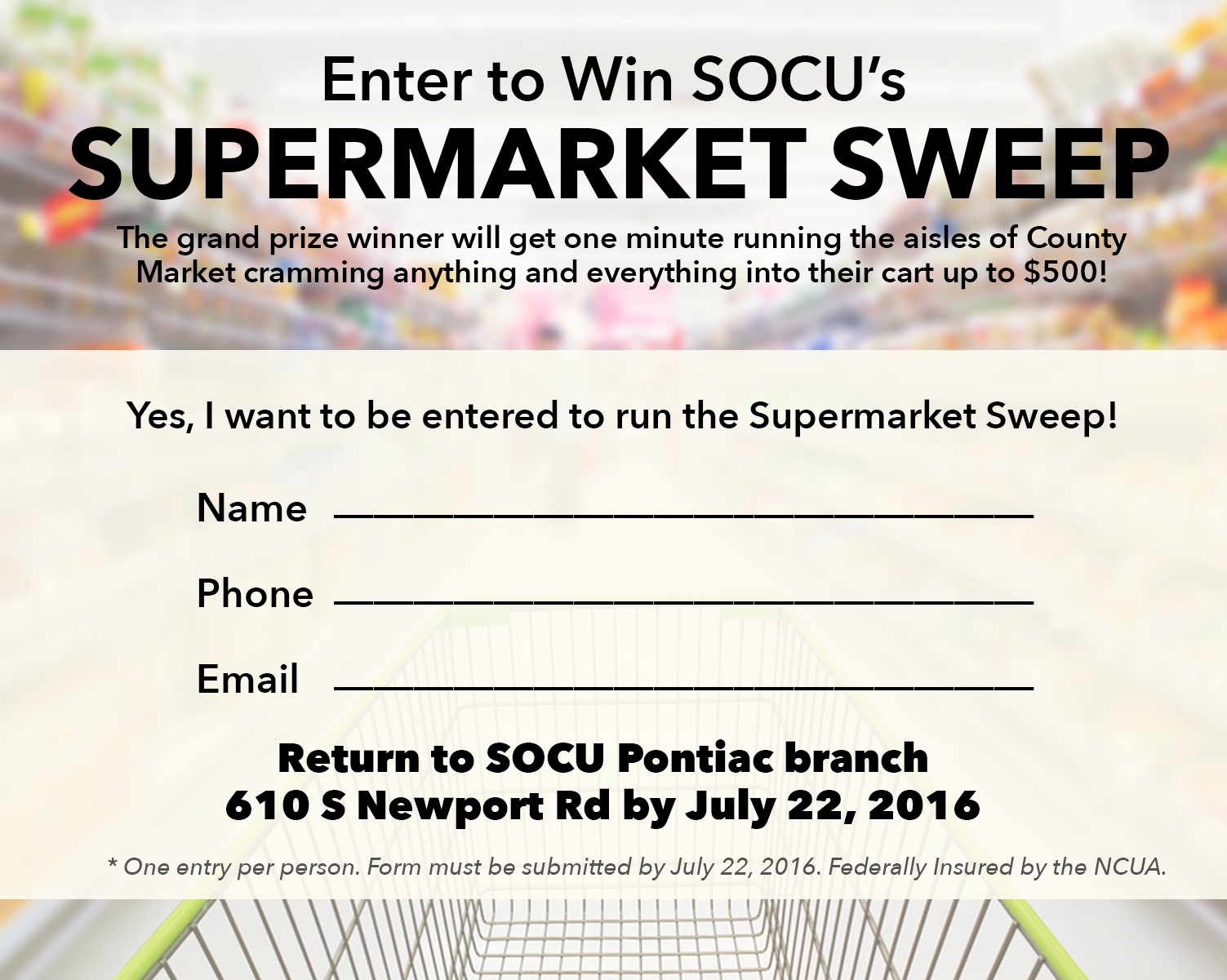 The grand prize winner will get one minute running the aisles of County Market cramming anything and everything into their cart up to $500! Print out the form below and bring it into any SOCU branch today!