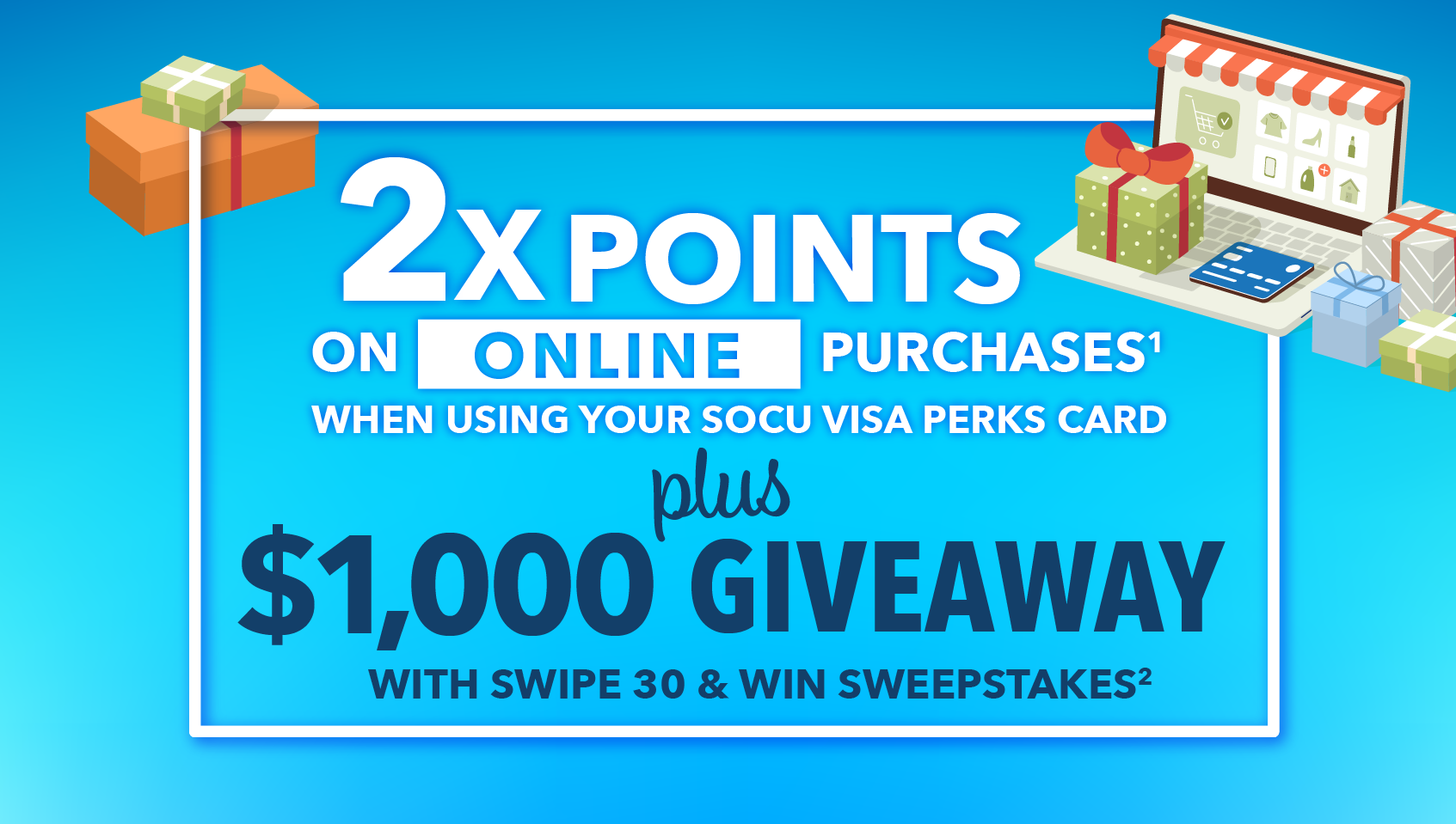 *All Visas are subject to credit approval. 1) Double ScoreCard Points will be awarded for online transactions charged to the SOCU Visa Perks Credit Card between Dec. 1, 2021 and Dec. 31, 2021. 2) Eligible on all SOCU Visa Credit Cards. No purchase necessary to enter or win. See Official Rules below for complete details on entries. Federally insured by the NCUA.